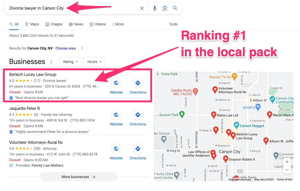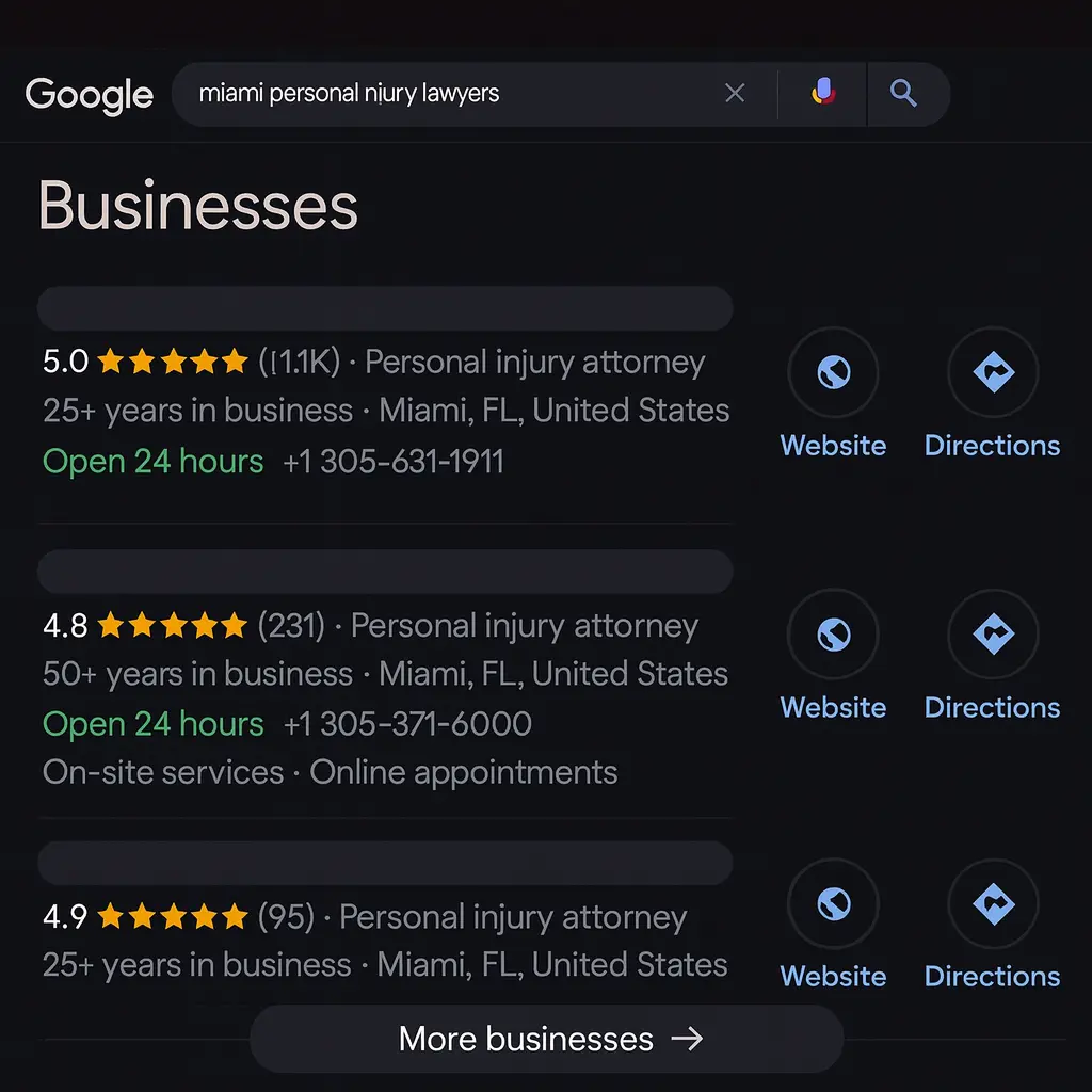 Local SEO targets location-based searches so your firm appears in the Google Maps Pack when people search for attorneys in your city.